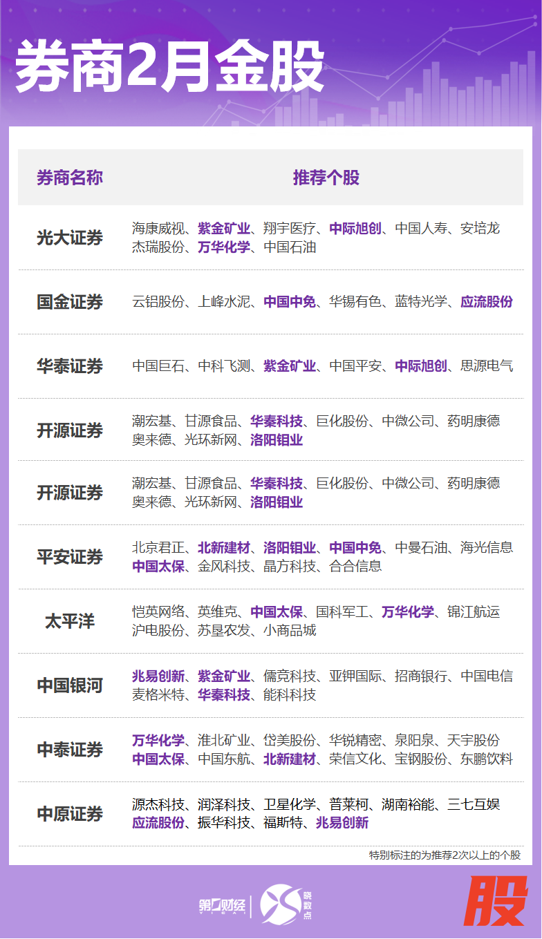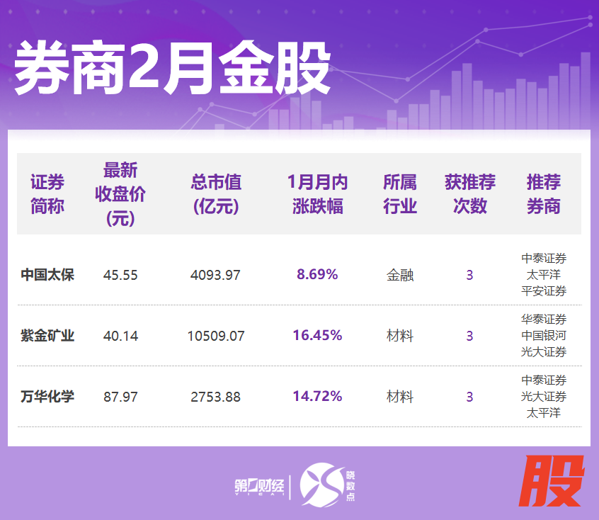 据不完全统计,在各家券商的“金股”名单中,中国太保、紫金矿业、万华化学均获得3家券商的推荐,中际旭创、北新建材、兆易创新、中国中免、应流股份、华秦科技、洛阳钼业获得2家券商的推荐。