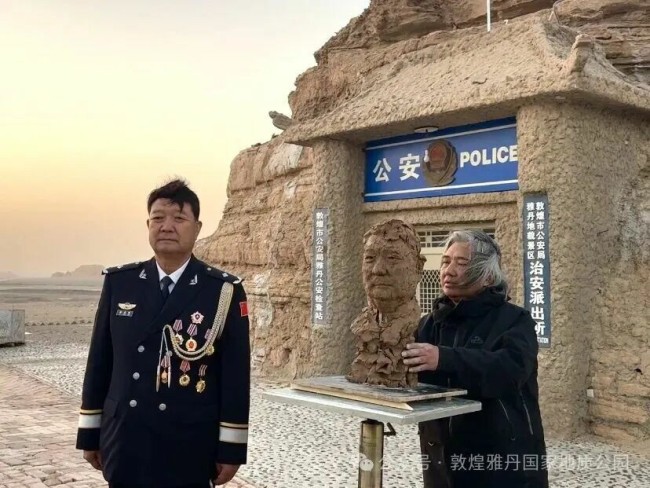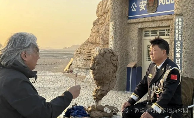傍晚时分,吴为山来到敦煌市公安局雅丹治安派出所前,转身走向早已备好的雕塑台。端坐台前的李生寿,正是这片土地最生动的注脚:作为雅丹派出所原所长,他在75摄氏度温差的极端环境中带领战友凿出窑洞派出所,在罗布泊边缘完成198次救助,24年的坚守让“全国最美基层民警”的称号实至名归。“塑人先塑魂股策略,这尊像要留住的是大漠无法磨去的坚守。”吴为山的指尖在泥土上流转,将西方写实技巧与中国传统雕塑的写意神韵相融,精准捕捉李生寿眉宇间的刚毅与温和。