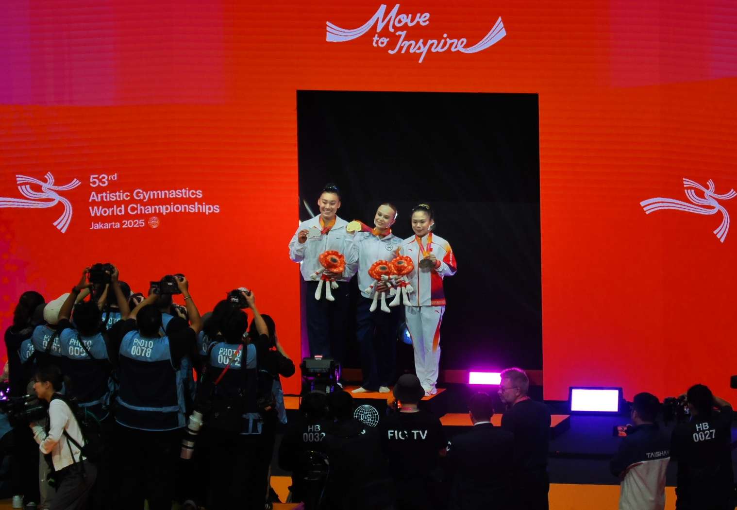 图为冠亚季军站在领奖台上合影。本届世锦赛男女10个单项比赛的全套体操器材,均由中国泰山体育生产。其全球首创的碳纤维体操器械,也在本次赛事中亮相。